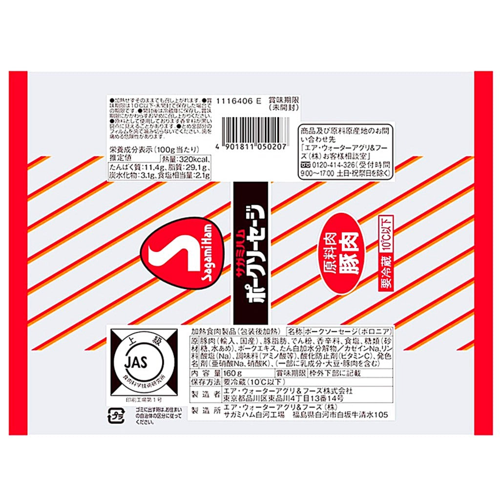 サガミハムの代表製品である「ポークソーセージ」です。原料肉は豚肉のみを使用し、研究を重ねたオリジナルブレンドのスパイスで味と風味を引き出しました。いつまでも飽きのこない味わいに仕上げたJAS上級グレードのロングセラー製品です。当社の昔からの自信作であり、多くのファンの方に愛され続けている人気商品です。